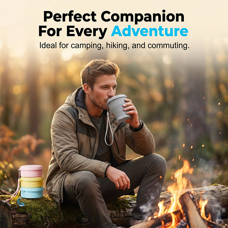 ULTRA-COMPACT COLLAPSIBLE TRAVEL CUP - Discover the ultimate space-saving solution with our premium collapsible travel cup. Designed for modern explorers, it features a secure lid and durable lanyard for effortless portability.